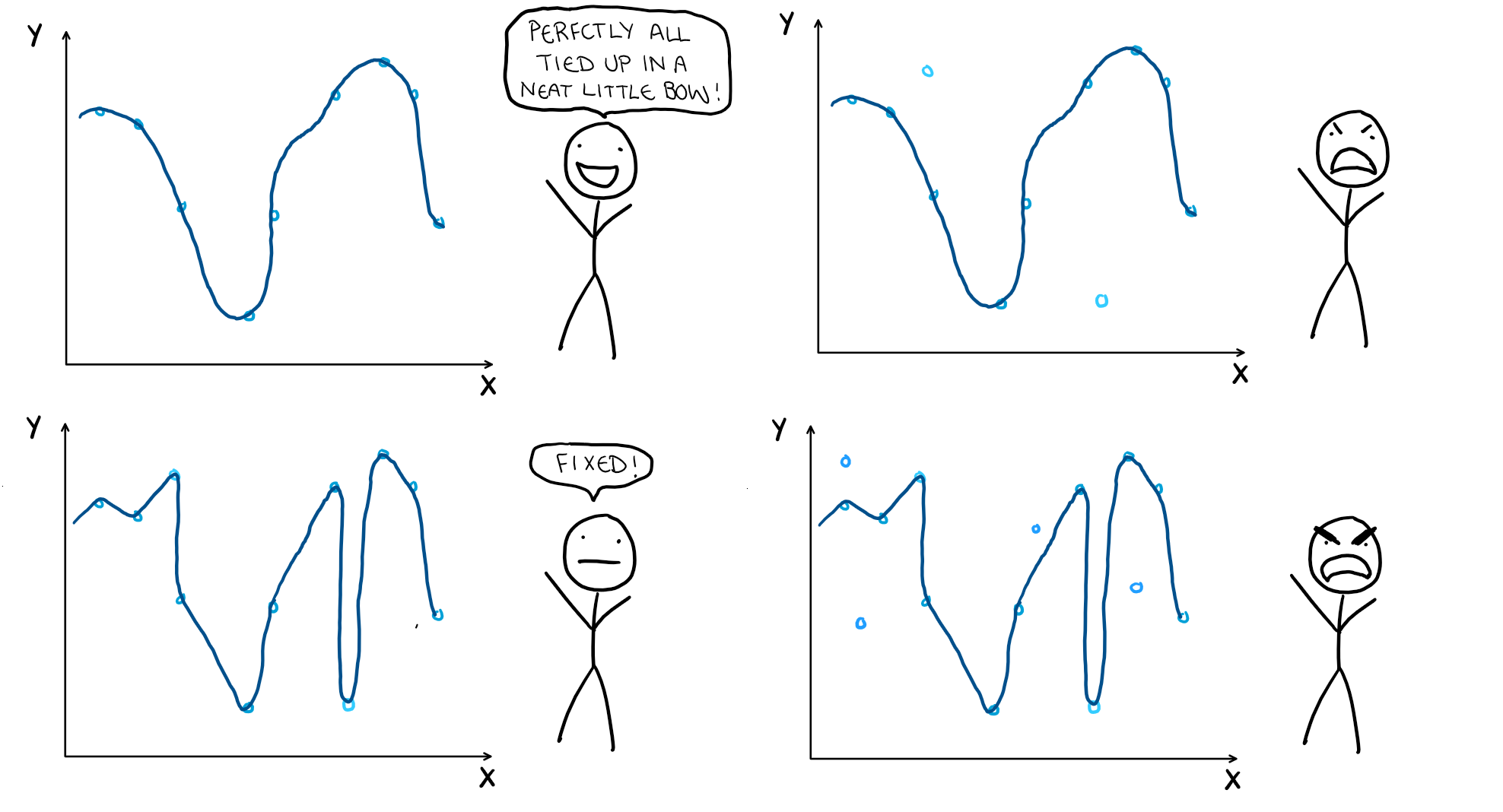 Obviously we can never have a perfect prediction since we are working with random variables. We can make our models more flexible to try and account for as much of the error as we can, but if we do, we might end up missing the underlying system entirely. No matter how flexible our model is, we will never have perfection thanks to our irreducible error (an attempt at making one is illustrated below). The interaction between flexibility and irreducible error comes from its size. A large irreducible error means the general shape change more drastically between samples, while a small one means our samples will remain consistent. Just like dimensionality, assumptions about our model, and sample size, this is just something that needs to be kept in mind as it has a strong interaction with the flexibility of our model, and the error from variance.