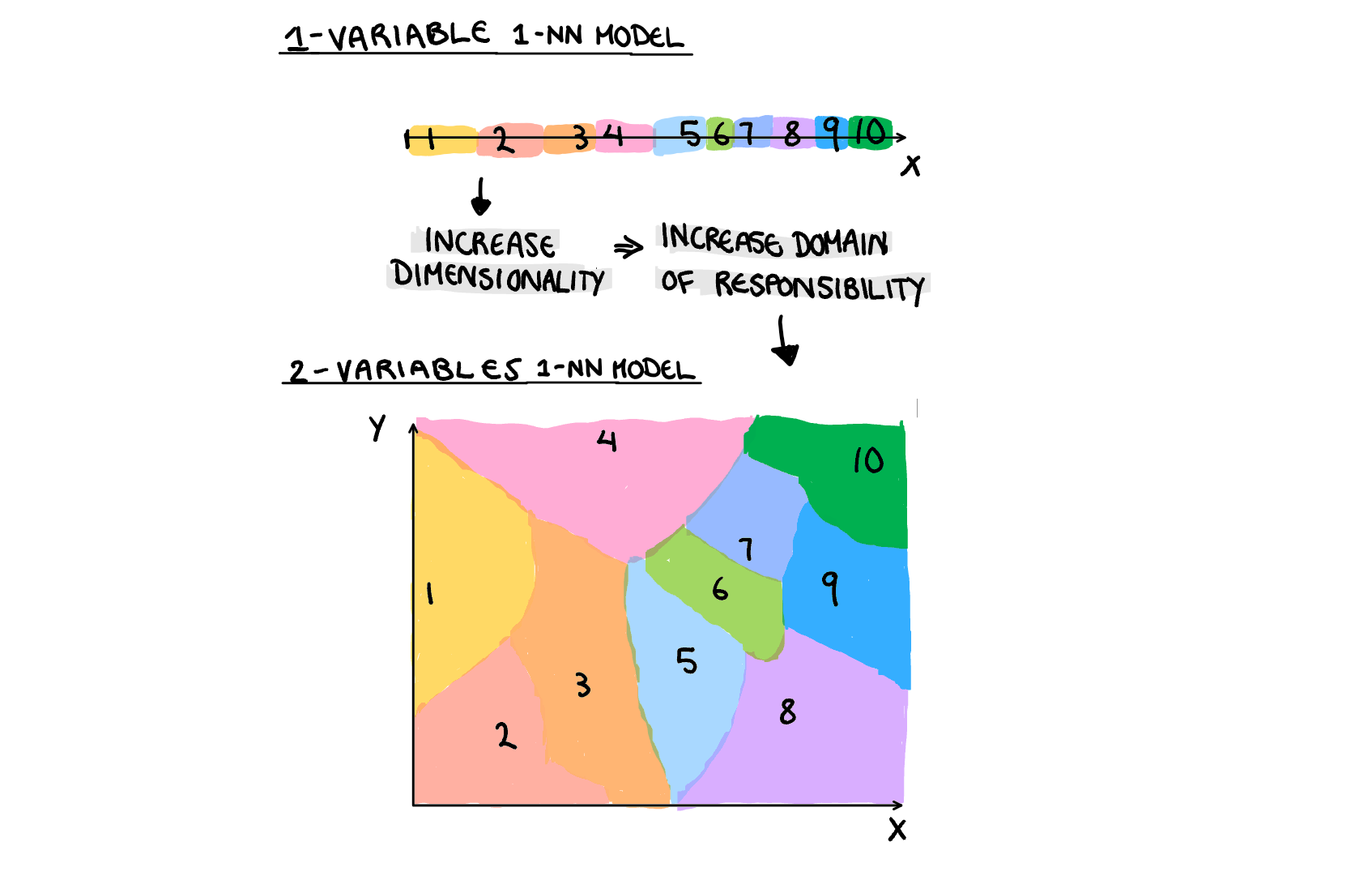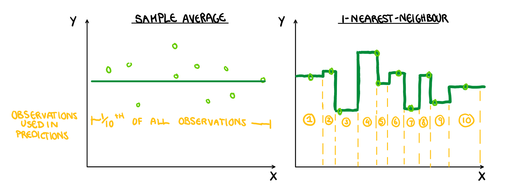 In general, the larger your sample size, the more likely it is you have captured the “true relationship”. If you are increasing the number of parameters to estimate (not literally for non-parametric models but the idea carries on) without increasing the sample size, we are in effect decreasing the “sample size” for each of the estimated values, and thus decreasing the reliability of our model. Placing more weight on all the observations in calculating our estimates, means we are increasing the influence of outliers and unrepresentative samples. We can either have observations contributing to a large area but averaged over many observations, or over a small area where our estimates are averages over fewer observations. For example, if we have 10 observations and predict using the average, each observation contributes to 1/10th of the prediction, if we use 1-Nearest Neighbour, each prediction is only backed up by a single observation (illustrated below). Highly flexible models can be, and sometimes are, the appropriate choice to model a relationship, we just need a large sample to justify it. Outrageous claims need outrageous evidence.