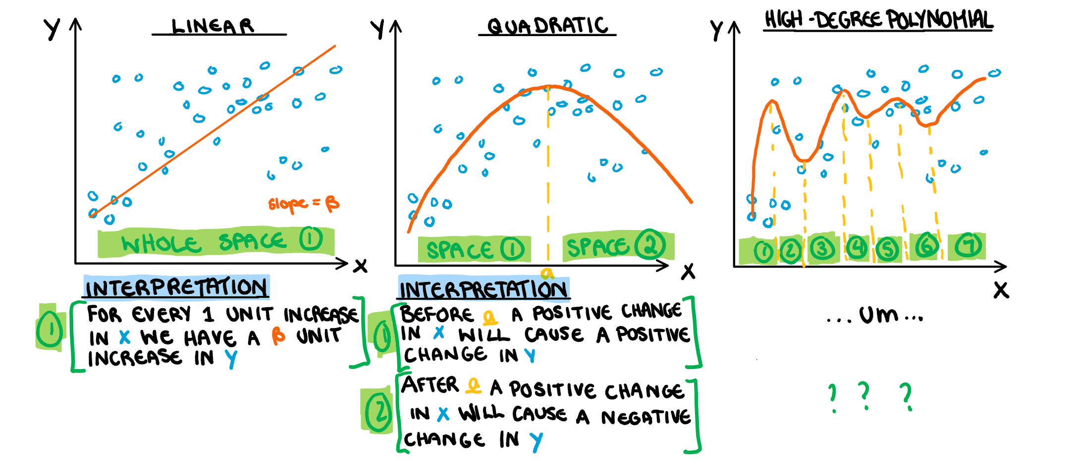 I have mentioned (at length) the bias and variance trade off that comes into play when considering the flexibility of a model. What I have not mentioned, is the interpretation trade off that happens at the same time. When we “localise” our model by increasing its flexibility, allowing it to better respond to changes in variables, we also “localise” the possible interpretation. This in turn, means that a single interpretation for the entire span of the possible inputs is no longer useful. At the extreme end of this trade off, we have models in which the intermediate steps are almost impossible to understand, called “black box” models. Early statistics courses introduce flexibility with quadratic models, and deal with the trade off by splitting the area of interpretation. Sadly this is not an idea that easily lends itself easily to more complicated models, a problem I have illustrated below.