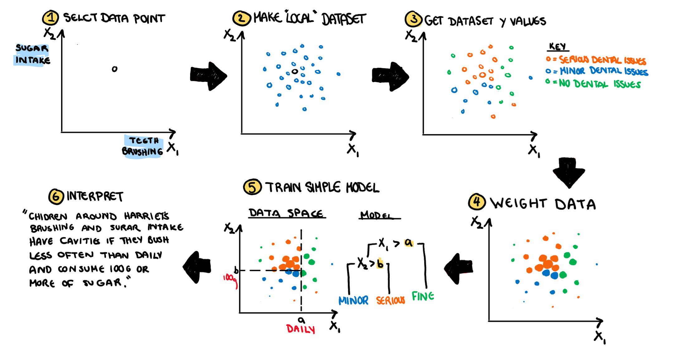 The main idea of LIME is the same main idea of calculus, which is if we zoom in a bunch we can approximate crazy non-linear functions with straight lines. These approximations are pretty good around that point, but get worse the further we move away. The way it works is actually quite simple and can be broken down into a handful a simple steps. 1. Make a localised dataset based on a single observation 2. Build a model on this localised dataset 3. Interpret that model. Some of the technicalities of the process change depending on the type of data we have (tabular, images or text) and I will go through each of them, but in essence, the idea is the same. I’m going to walk through trying to predict cavities based on the three types of data to illustrate the process of LIME, but keep in mind, I’m assuming we already have some trained model that is making prediction, and a set of test observations. Is crushing pain, blackening teeth, or an exclusive diet of raspberry cordial a predictor of cavities? Lets find out.