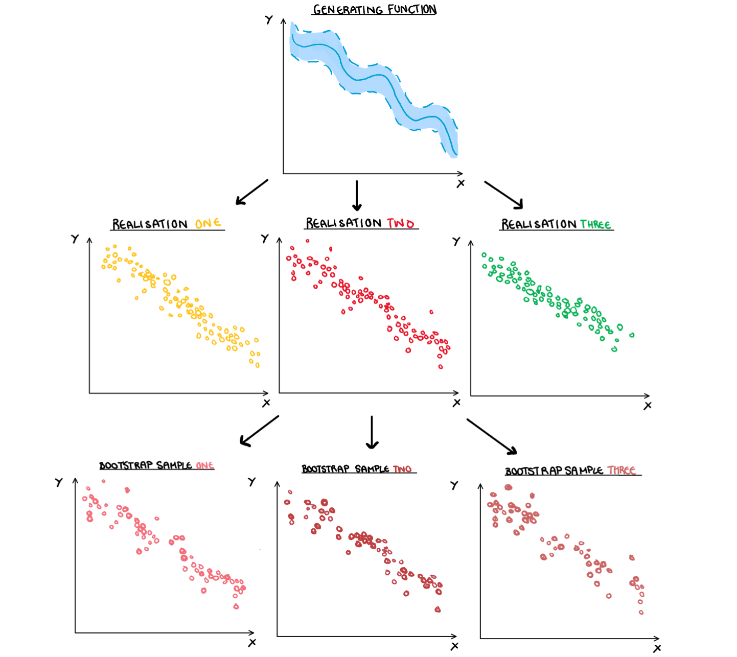 If our data creation process was forced into the context of a family tree, simulated data would be the parent of the bootstrap sample. A simulation of a simulation if you will. If we illustrate this, we need to start with our random process, the true data generating process that we assumes exists but can never truly know. This process creates our data (or simulation if we are working artificially) which turn creates our bootstrapped samples.