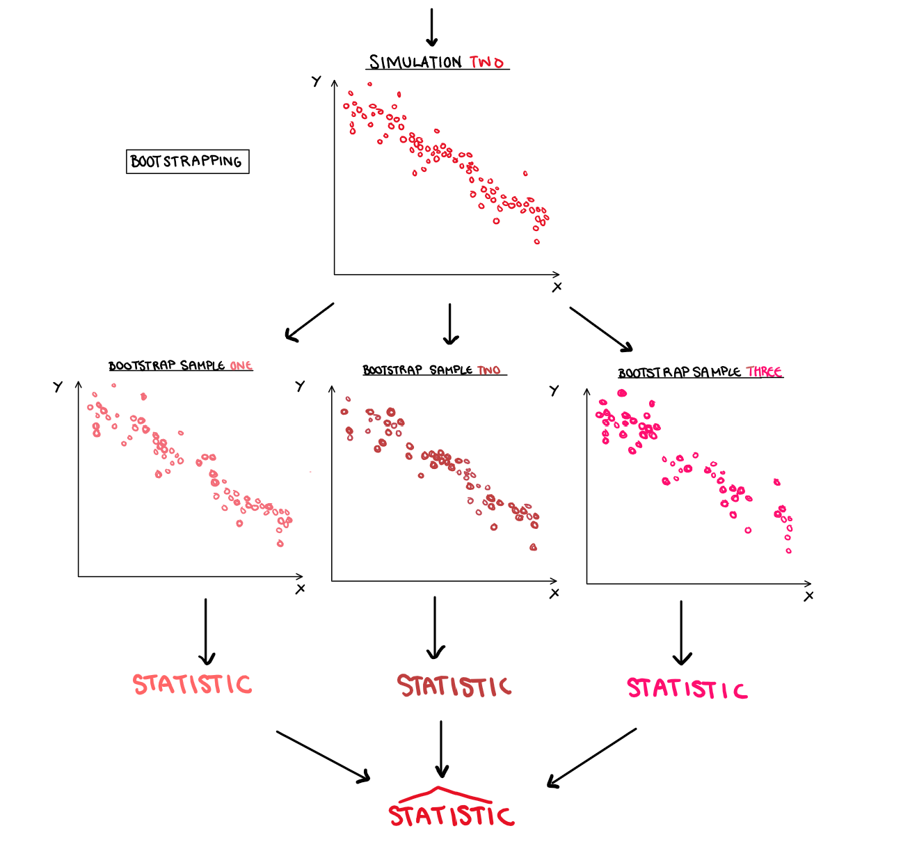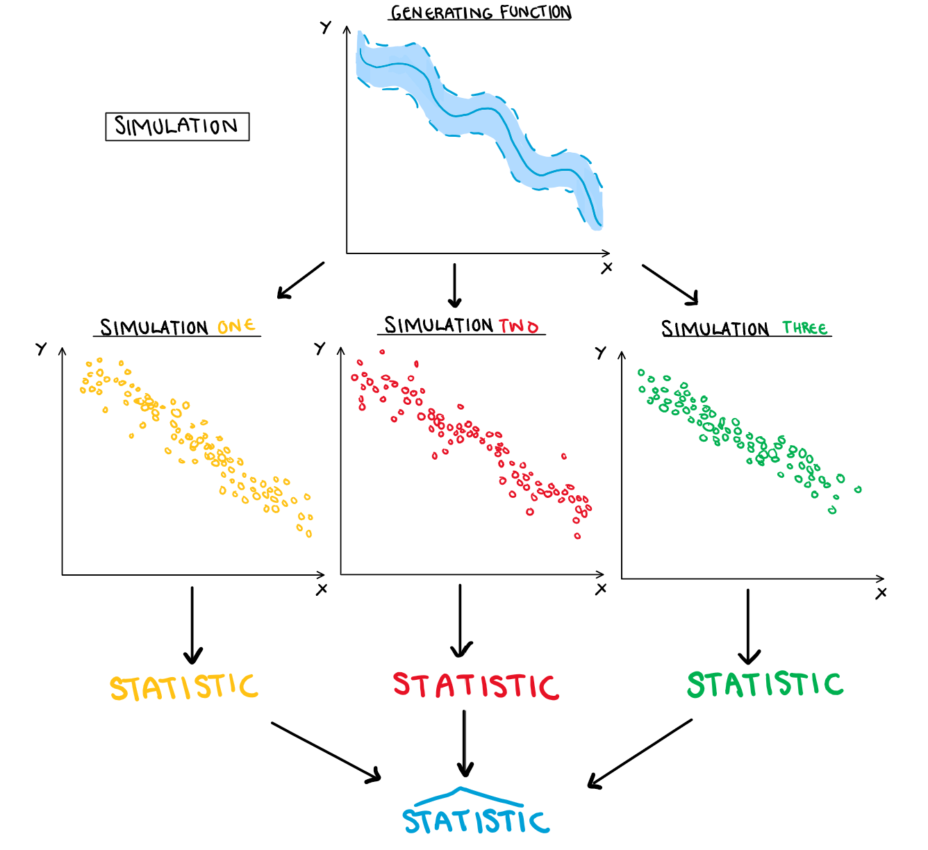 Bootstrapping is a little different but follows a similar idea. Instead of the source being a generating function, it is one of the simulations. To replicate the effect of independent trials, we sample with replacement from the data and generate a new dataset. This new dataset is essentially a simulation of that original simulation. Much in the way that simulation takes one step back and looks at the true relationship, bootstrapping takes one step back and can be used to estimate statistics in the data.