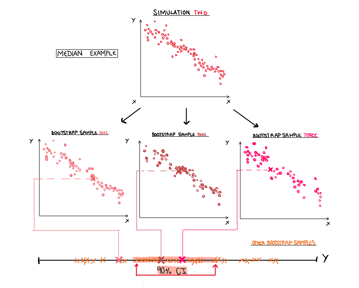 If we repeat this 100 times, we get 100 medians, which we can sort in ascending order, and get a confidence interval for the median. Using this method, we have managed to save my classmates from being dragged down by my terrible paper.