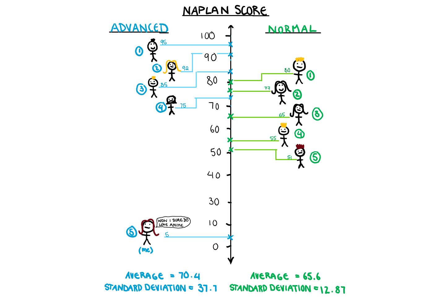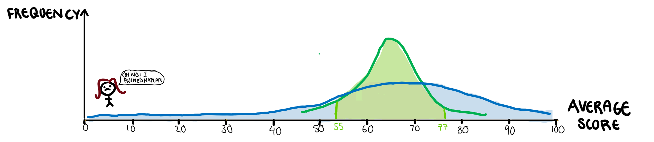 When I was a child, I did so badly in the year 5 NAPLAN writing that the school insisted on moving me from advanced, to remedial English. My paper, as my teacher explained to my mother, seemed to be a summarised plot of the anime “Full Metal Alchemist”, written in one sentence that spanned several pages, with no punctuation, and mostly incorrectly spelled words. This was coming in hot after my older brother, three years my senior, had also failed a large portion of his NAPLAN tests because he was “too busy thinking about his imaginary Pokémon” to answer the questions, and randomly filled in bubbles in the last 5 minutes. We are going to use my attack on the advanced class average as an example in bootstrapping.