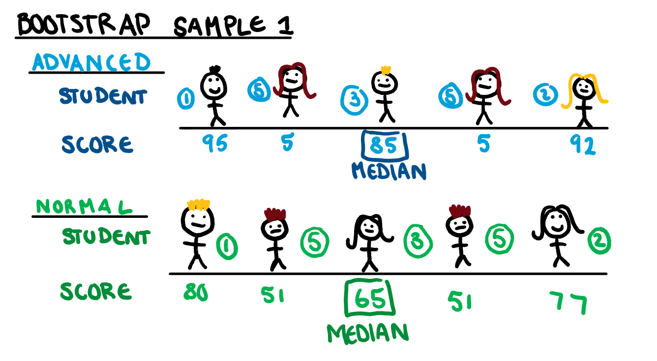 The bootstrap comes to our aid here in two ways. First of all, finding the average of several bootstrapped samples can help with eliminating problems caused out outliers. In this case, since the sample size is only 5, that doesn’t quite work here, but with a sample size that isn’t limited by how many stick figures I can draw, it’s quite useful. Instead, we want to use the median to compare the two classes, since outliers don’t affect it. The problem with the median, is that unlike the mean, it doesn’t have any nice theorems that give us its variance. This is the second way bootstrapping can come to our aid, to create confidence intervals for our median.