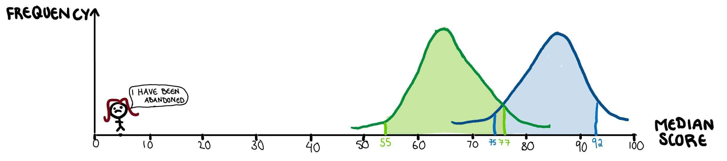 Lets say the advanced class and the regular class both have 5 students each (they didn’t but drawing those stick people gets tiring). All these students have an associated test score, and the staff want to compare the two classes. Simply using the mean of the two classes will cause issues, since the mean is susceptible to be skewed by outliers, and my idiot paper is a big outlier.