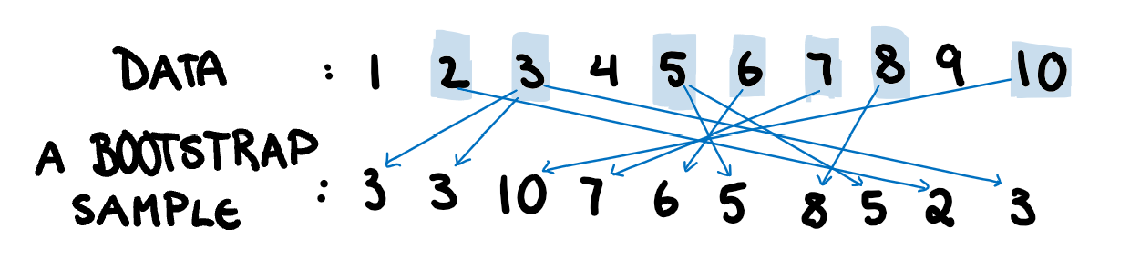To create each bootstrap sample, we will randomly sample our data with replacement 5 times. An example of what one of the bootstrapped samples would look like is shown below.