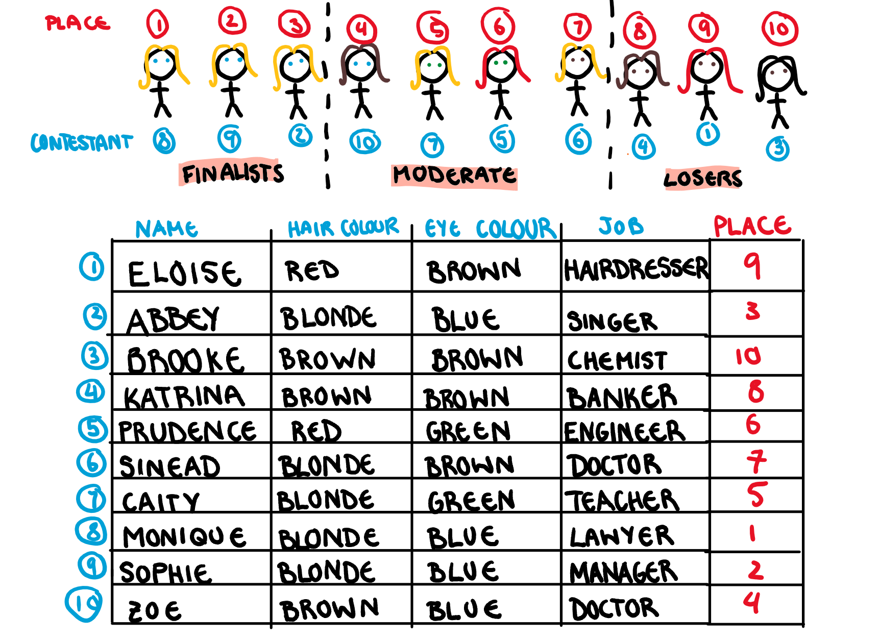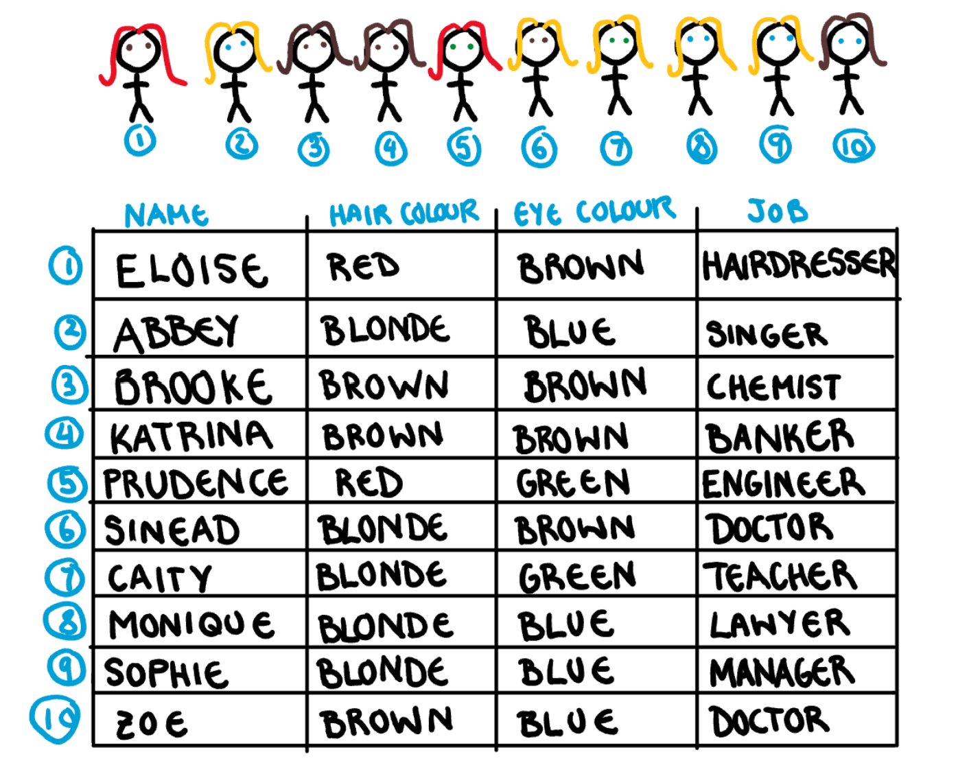 For our illustration, let’s make an example competition that consists of 10 people, broken down into their most arbitrary characteristics: name, hair colour, eye colour, and job.
