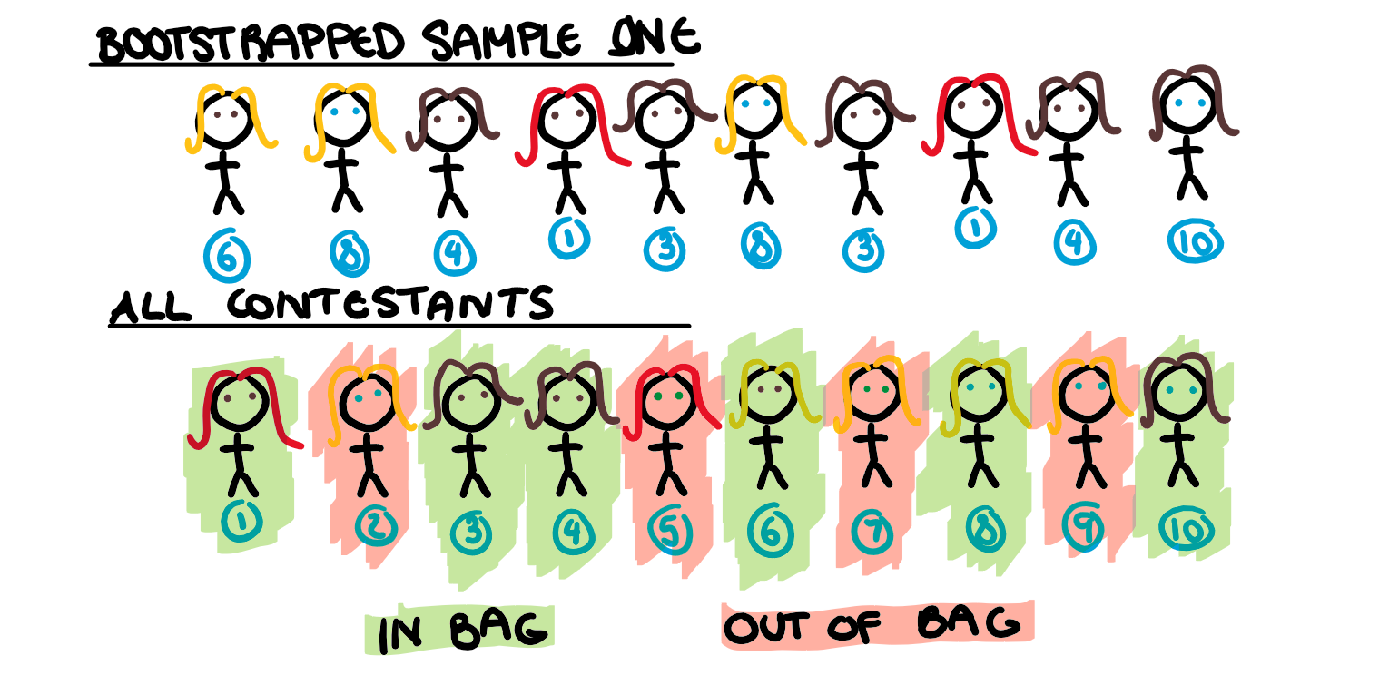 Before we can even look at variable permutation, we need a random forest model. If you need refreshing on how they work, a random forest model will take B bootstrapped samples, and build a tree for each. Usually, just by chance, about a third of the contestants will not be used to build each tree, these are the out of bag contestants.