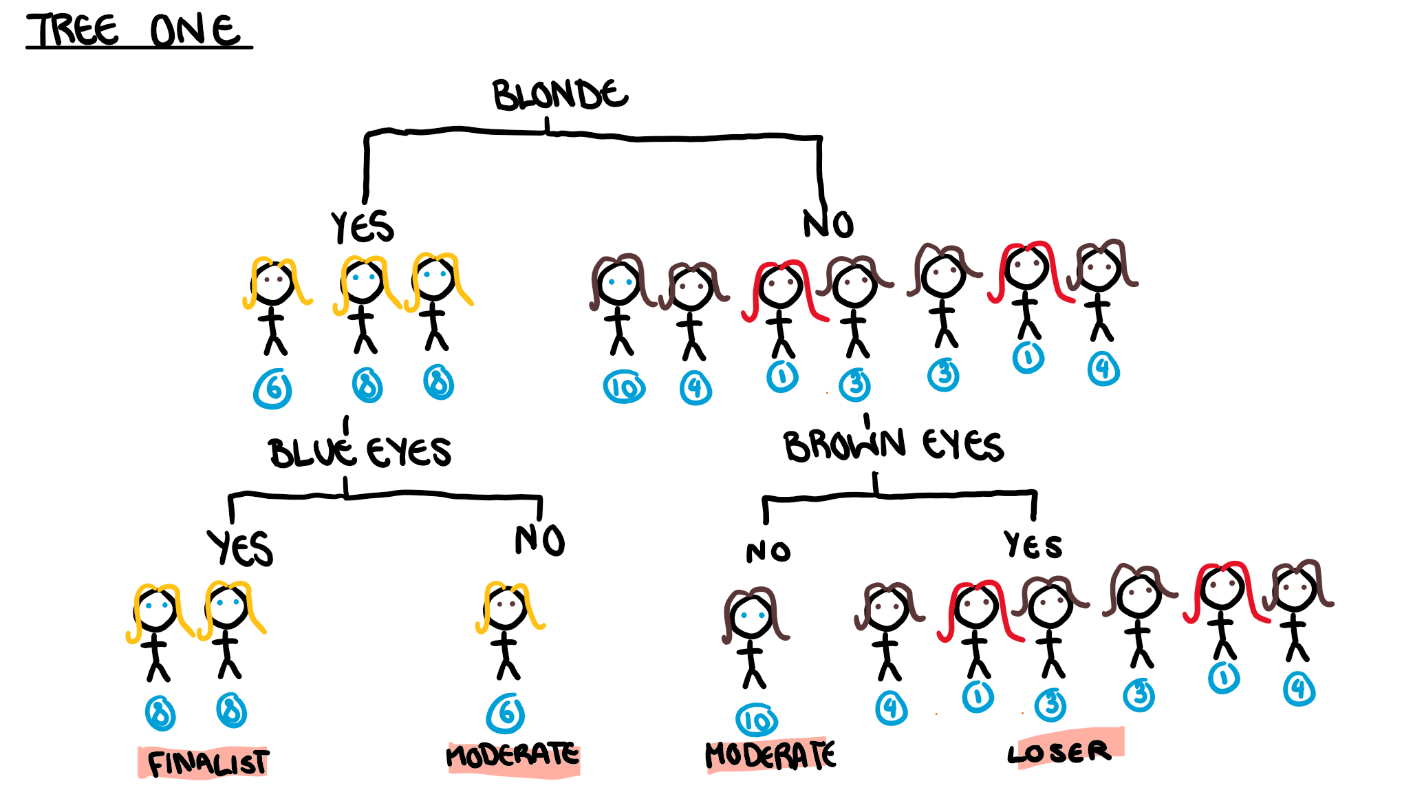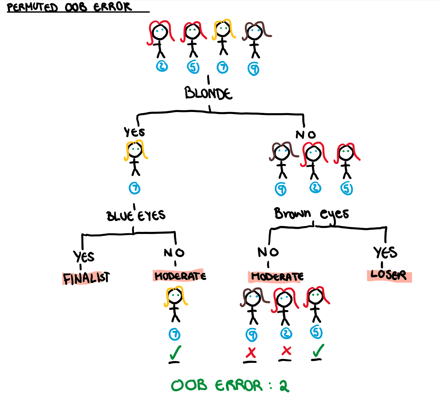 Rationally, we can tell that if our Bachie isn’t using hair colour as a key decider for his life partner (as we would hope), randomising that variable would have no effect on the girls position in the competition. People getting divorced over dyed hair is no way for a society to function. Again, we calculate our OOB error, using the tree above and contestants 2,5,7 and 9. However, we now take our predictors from the table with the permuted hair variable.