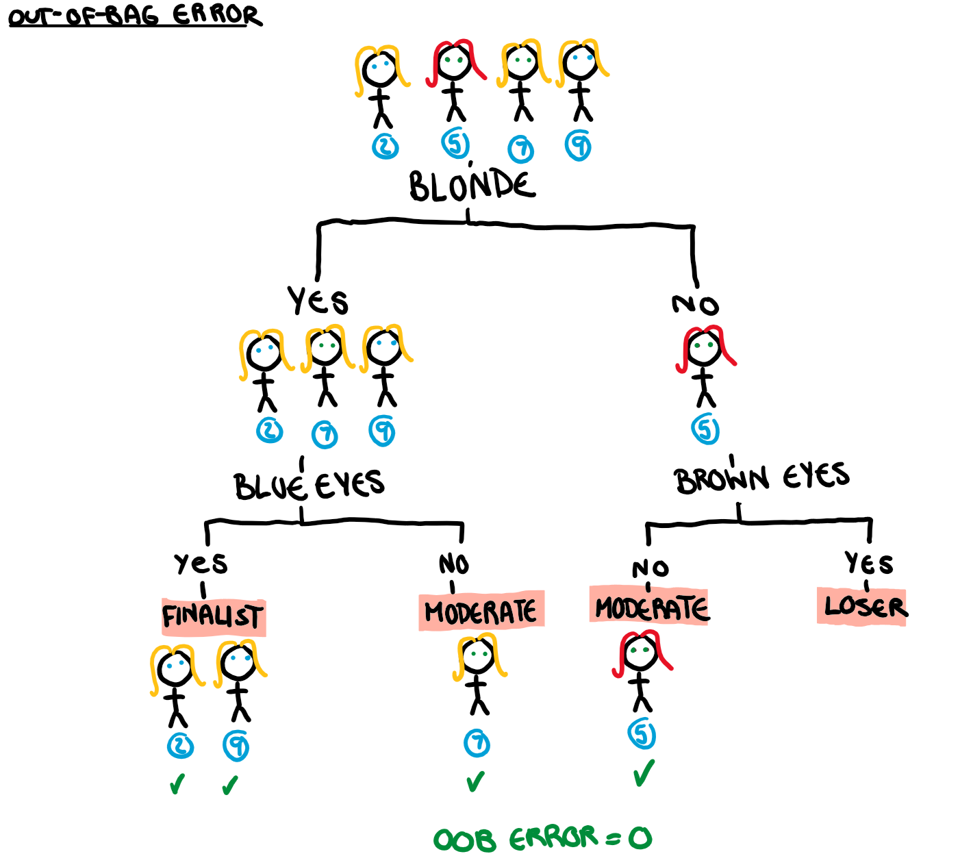 Contestants 2,5,7, and 9 are our out of bag contestants and so were not used to build the tree. Running these four contestants through the tree we get our out-of-bag (OOB) error.