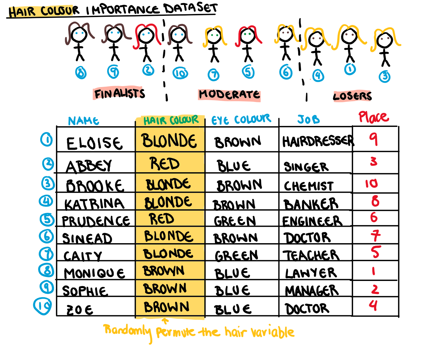 To calculate the importance of a variable (in this case hair), we randomly permute that variable among the observations. This creates a new dataset where all the variables are the same EXCEPT for the one variable we are checking. So for the bachelor example, the girls have all the same characteristics as before except their hair colour is randomised.